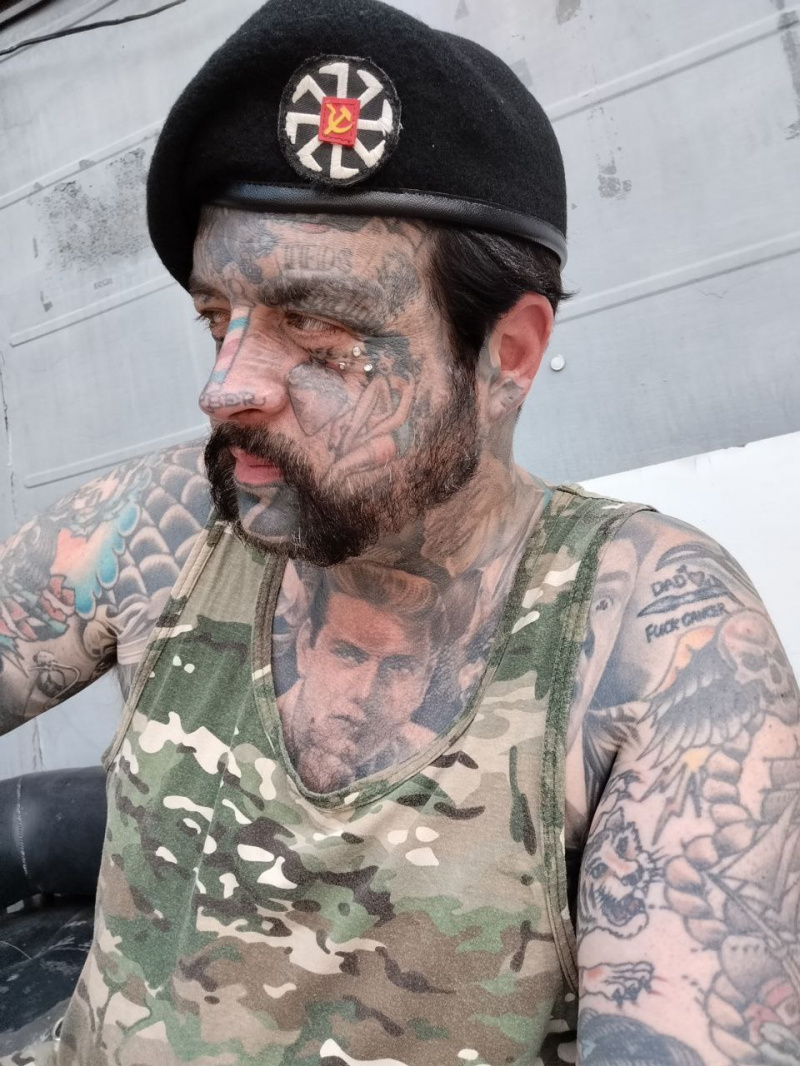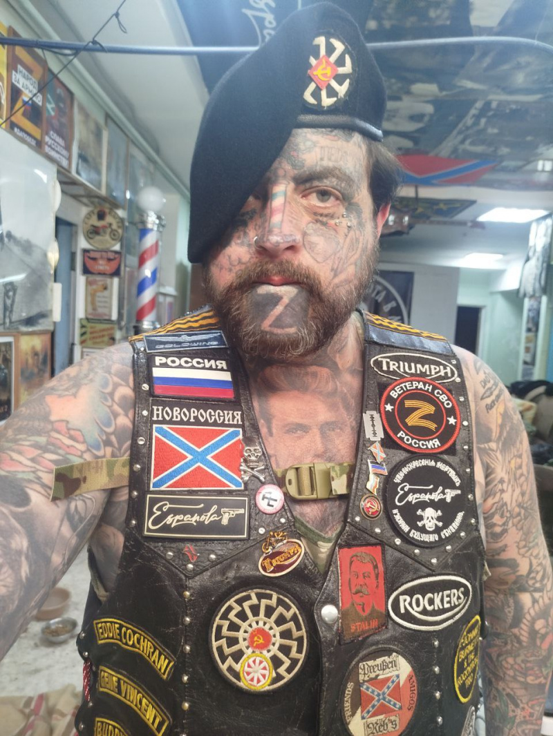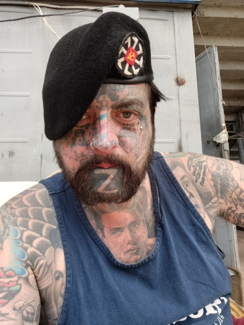 Что за рожа у него набита на груди - не опознал, но мне интересно, где у него набита рожа Путина - на заднице, что ли?