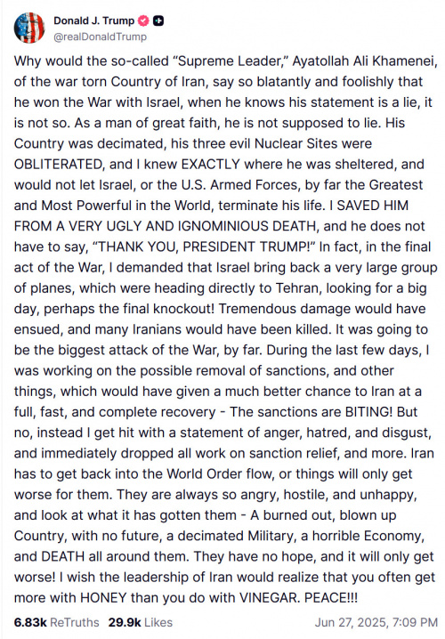 Почему так называемый «верховный лидер» Аятолла Али Хаменеи из раздираемой войной страны Иран так откровенно и глупо заявляет, что он выиграл войну с Израилем, когда он знает, что его заявление является ложью, что это не так. Как человек глубокой веры, он не должен лгать. Его страна была разорена, три его злобных ядерных объекта были УНИЧТОЖЕНЫ, и я точно знал, где он укрывался, и не позволил Израилю или вооруженным силам США, которые являются самыми великими и могущественными в мире, покончить с его жизнью. Я СПАС ЕГО ОТ ОЧЕНЬ УЖАСНОЙ И ПОЗОРНОЙ СМЕРТИ, и он не должен говорить: «СПАСИБО, ПРЕЗИДЕНТ ТРАМП!» На самом деле, в последнем акте войны я потребовал, чтобы Израиль вернул очень большую группу самолетов, которые направлялись прямо в Тегеран в ожидании большого дня, возможно, окончательного нокаута! Это привело бы к огромным разрушениям и гибели многих иранцев. Это была бы самая крупная атака за всю войну. В последние несколько дней я работал над возможным снятием санкций и другими вопросами, которые дали бы Ирану гораздо больше шансов на полное, быстрое и полное восстановление — санкции ДАВЯТ! Но нет, вместо этого я получил заявление, полное гнева, ненависти и отвращения, и немедленно бросил всю работу по снятию санкций и многое другое. Иран должен вернуться в мировой порядок, иначе для него все будет только хуже. Они всегда такие злые, враждебные и несчастные, и посмотрите, к чему это привело — к выжженной, взорванной стране без будущего, с уничтоженной армией, ужасной экономикой и СМЕРТЬЮ вокруг. У них нет надежды, и будет только хуже! Я бы хотел, чтобы руководство Ирана поняло, что МЕДОМ часто можно добиться большего, чем УКСУСОМ. МИР!!!
