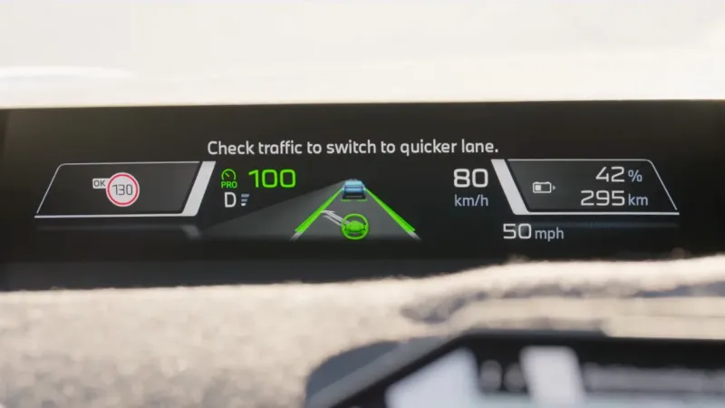 Когда автомобиль приближается к более медленно идущему автомобилю, на экране появляется символ обгона, и если его выбрать, то машина сама безопасно совершит обгон.