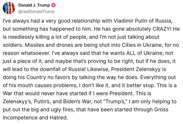 У меня всегда были очень хорошие отношения с Владимиром Путиным из России, но с ним что-то случилось. Он сошел с ума! Он без необходимости убивает много людей, и я говорю не только о солдатах. Ракеты и беспилотники стреляют по городам Украины без всякой причины. Я всегда говорил, что он хочет ВСЮ Украину, а не только ее часть, и, возможно, это так оно и окажется, но если он это сделает, это приведет к падению России! Точно так же президент Зеленский не приносит своей стране никакой пользы, когда высказывается так, как он это делает. Все, что выходит из его уст, вызывает проблемы, мне это не нравится, и это лучше прекратить. Это война, которая никогда бы не началась, если бы я был президентом. Это война Зеленского, Путина и Байдена, а не «война Трампа», я только помогаю потушить большие и уродливые пожары, которые были начаты из-за грубой некомпетентности и ненависти.