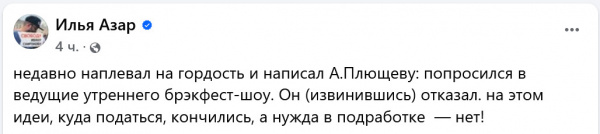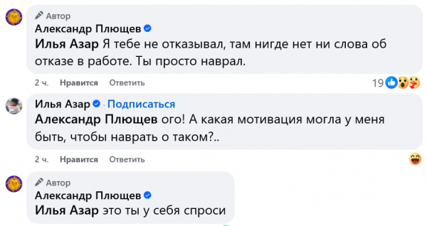 Однако дальше этот пост прочитал сам А. Плющев, который слегка офигел - нет, не от самого захода, хотя он вызывает многочисленные вопросы, - а от того, что в реальности Азар не просился к нему в ведущие утреннего шоу и отказа никакого не получал. Азар спросил у Плющева, не собирается ли тот открывать отделение своего шоу в Риге, потому что если собирается, то вот тогда Азар мог бы там работать. Плющев на это ответил, что у него таких планов нет, и на этом вопрос был закрыт. Как считал Плющев. Но оказалось, что к нему просились, а он отказал. А это совершенно не так, то есть Азар просто соврал. И когда его Плющев спросил, зачем он соврал, Азар ответил гениально.