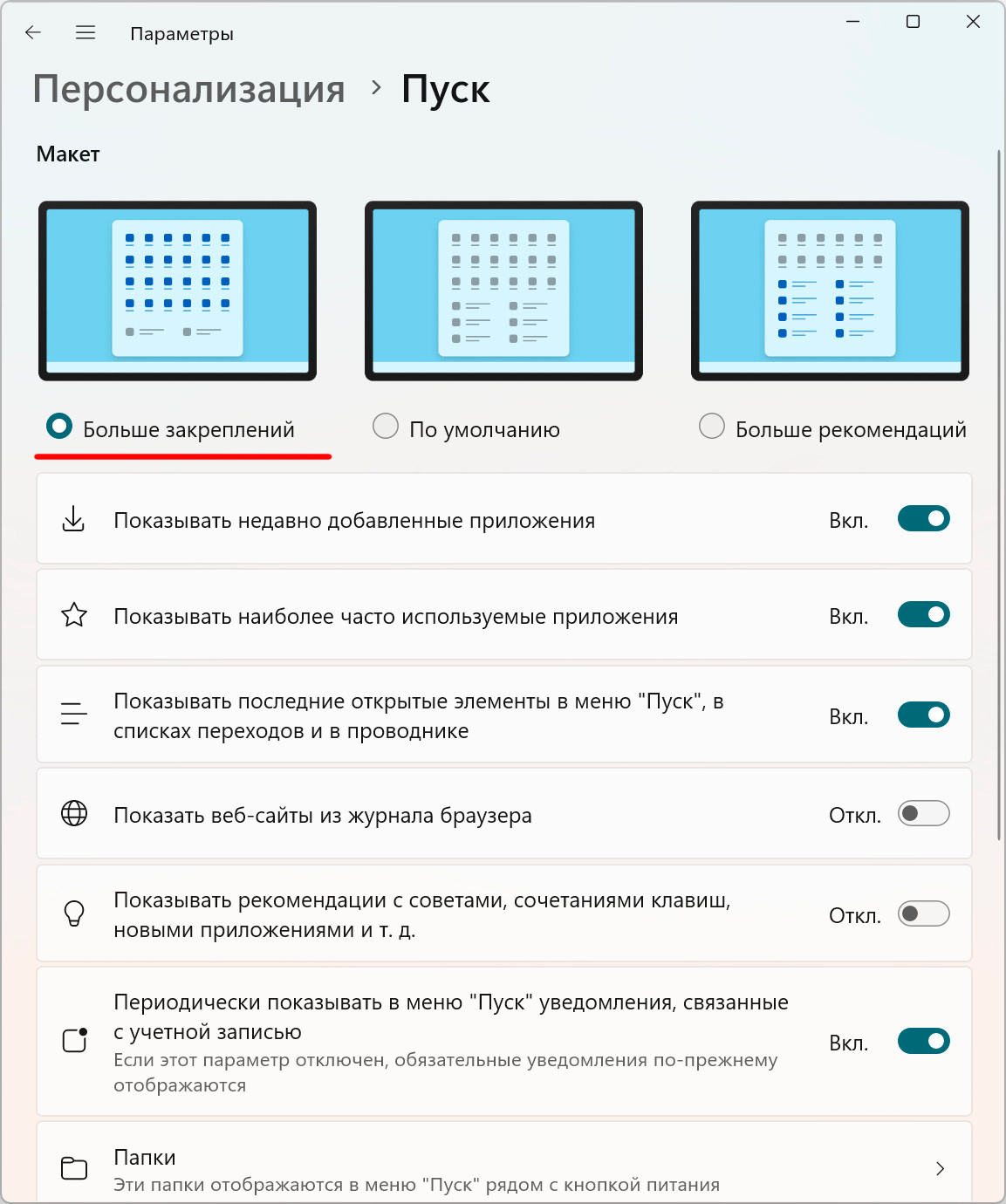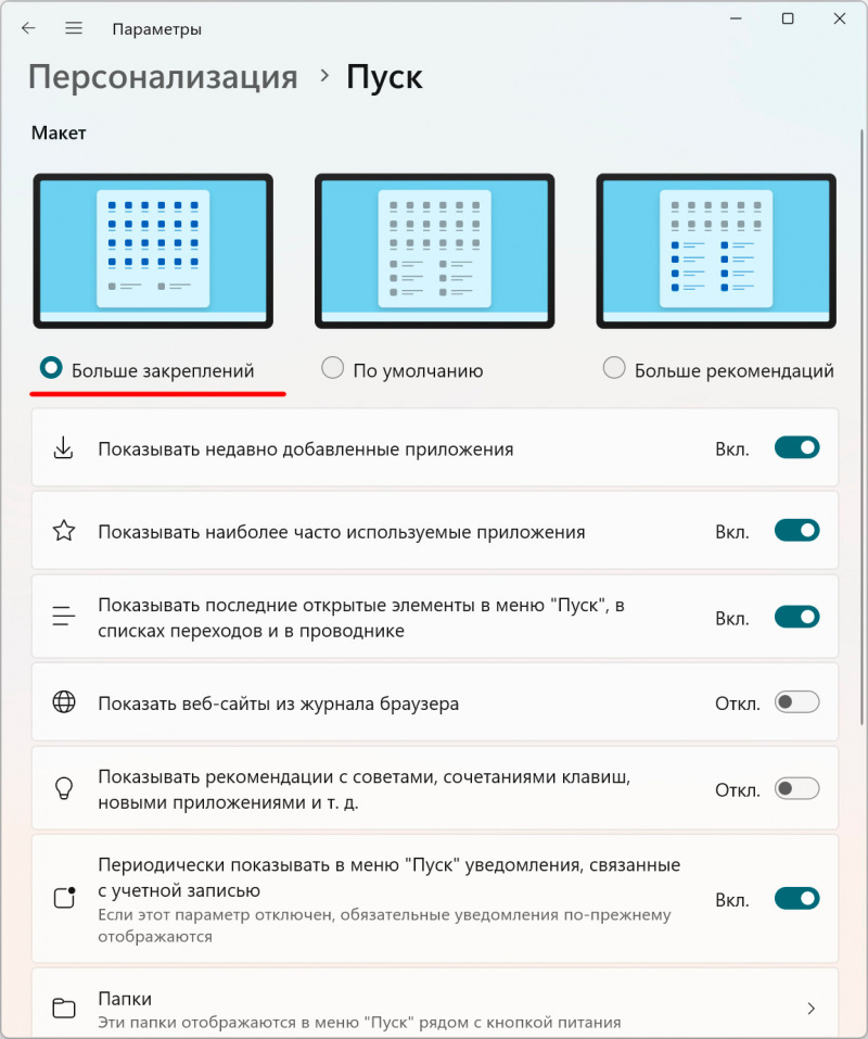 Также, кстати, саму кнопку "Пуск" можно подтюнинговать и, например, увеличить там количество закрепленных приложений за счет "Рекомендованных", которыми мало кто пользуется.