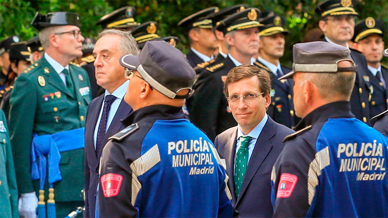 Мэр Мадрида Хосе Луис Мартинес Альмида и директор муниципальной полиции Мадрида Пабло Энрике Родригес во время мероприятия с полицейскими в 2023 году. ФЕРНАНДО АЛЬВАРАДО (EFE)