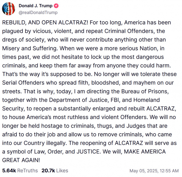 ВОССТАНОВИТЕ И ОТКРОЙТЕ АЛКАТРАЗ! Слишком долго Америка страдает от жестоких, насильственных и рецидивирующих преступников, отбросов общества, которые никогда не принесут ничего, кроме страданий и боли. Когда мы были более серьезной нацией, в прошлом мы не колебались, заключая в тюрьму самых опасных преступников и держа их подальше от тех, кому они могли навредить. Так и должно быть. Мы больше не будем терпеть этих серийных преступников, которые сеют грязь, кровопролитие и хаос на наших улицах. Поэтому сегодня я поручаю Бюро тюрем, Министерству юстиции, ФБР и Министерству внутренней безопасности вновь открыть значительно расширенную и перестроенную тюрьму АЛКАТРАЗ для содержания самых жестоких и опасных преступников Америки. Мы больше не будем заложниками преступников, головорезов и судей, которые боятся выполнять свою работу и позволяют нам избавляться от преступников, незаконно проникших в нашу страну. Повторное открытие АЛКАТРАСА станет символом закона, порядка и СПРАВЕДЛИВОСТИ. Мы СНОВА СДЕЛАЕМ АМЕРИКУ ВЕЛИКОЙ!