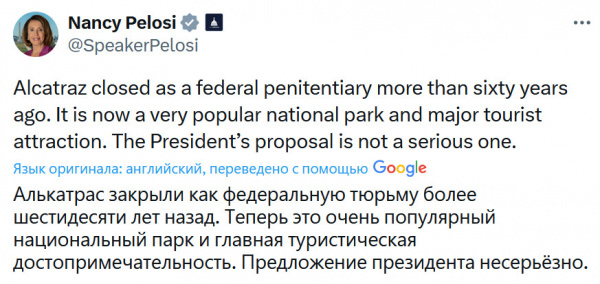 У Трампа, конечно, ни дня без репризы. Вчера он проснулся с бодуна, и у него возникла гениальная идея открыть тюрьму Алькатрас. Не в смысле - открыть для туристов, для которых она открыта последние лет -цать, а в смысле - снова сделать из нее тюрьму и туда посадить особо опасных преступников или тех, кого Трамп считает особо опасными преступниками.