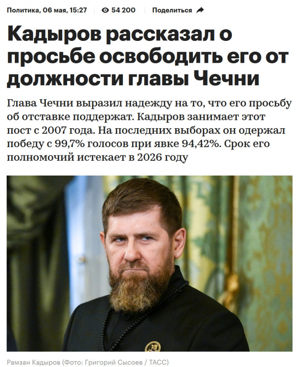 Они что, первый раз в эту игру играют? Кадыров громогласно просит освободить его от должности главы Чечни, после этого Путин устами Пескова заявляет, что такими ценными кадрами разбрасываться не намерен, что Чечня без Кадырова - это как Россия без Путина, то есть никуда, поэтому, дорогой Рамзан, правь еще дальше, еще до ста двадцати и двухсот сорока.