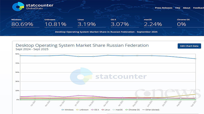 Это касается, в том числе, и операционных систем. Самая популярная настольная ОС в России – это Windows американской корпорации Microsoft. Она занимает 80,69% российского рынка ПК (сентябрь 2025 г., StatCounter).