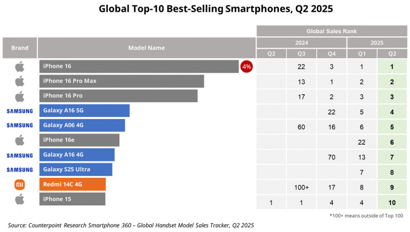 Компания Counterpoint опубликовала таблицу Top10 самых продаваемых смартфонов во втором квартале 2025 года.