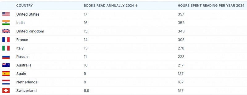 Соединенные Штаты – Американцы, самые плодовитые читатели в мире, в среднем тратят на чтение почти 7 часов в неделю. Это соответствует 357 часам в год.