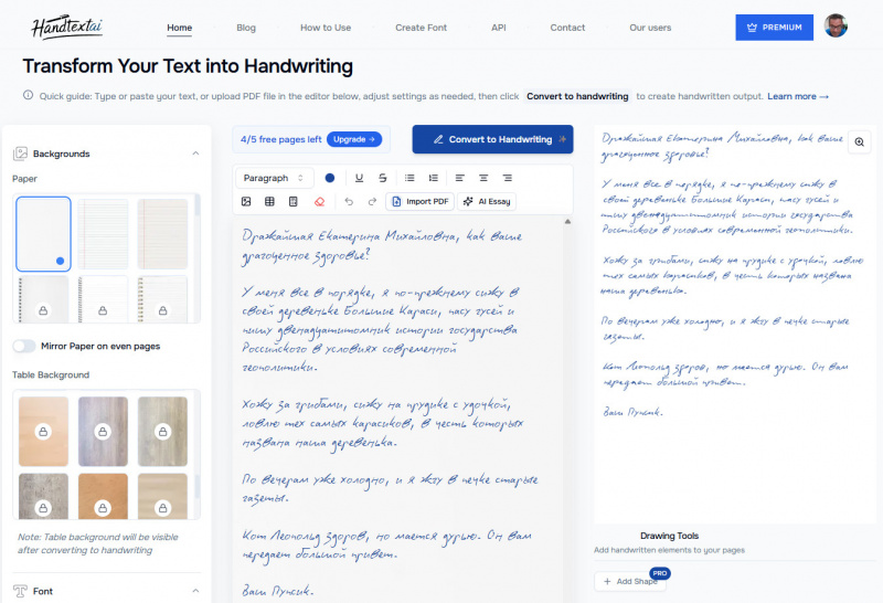Нейронка, превращающая компьютерный текст в рукописный с высокой достоверностью. Причем там все еще и гибко настраивается - можно подобрать настройки под свой собственный почерк. Текст можно скопировать в соответствующее окно, также можно загрузить PDF. Если в тексте есть всякие таблицы, то они тоже адаптируются под рукописный текст.