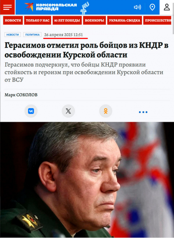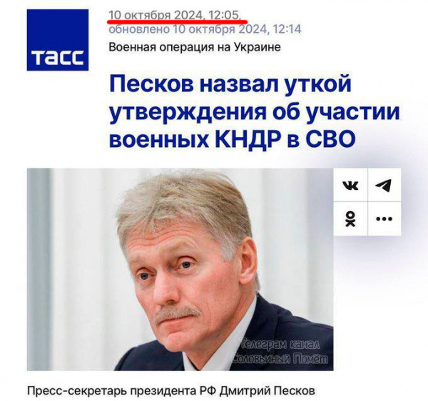 Пресс-секретарь Путина Песков, правда, незадолго до этого отвечал, что в войне никакие северокорейцы вообще не участвуют, но, как мы знаем, милые палятся - только тешатся.