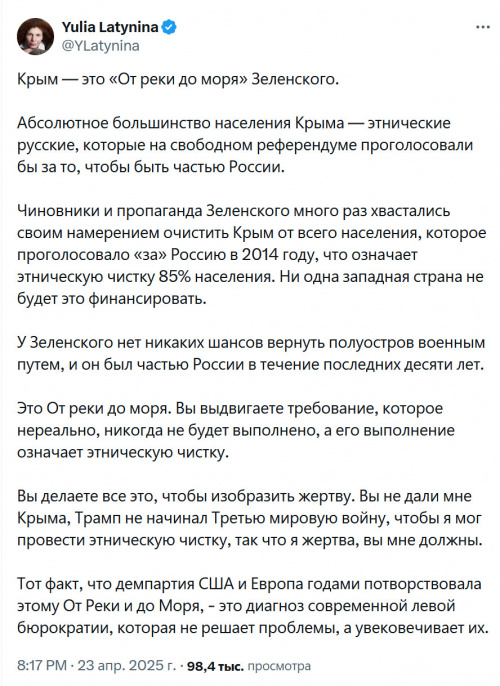 Про то, что "чиновники и пропаганда Зеленского много раз хвастались своим намерением очистить Крым от всего населения, которое проголосовало «за» Россию в 2014 году" - это настолько наглое вранье, что такое себе даже Арестович вроде бы не позволял. Впрочем, хрен знает, что он там сейчас несет, я его, понятное дело, не слушаю.