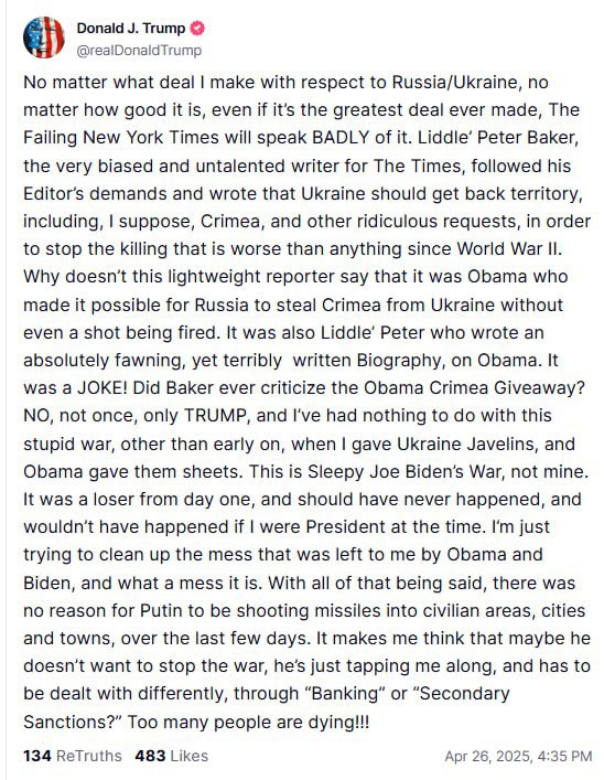 Это война Сонного Джо Байдена, а не моя. Она была обречена с самого начала, не должна была произойти и не произошла бы, если бы я был президентом в то время. Я просто пытаюсь убрать за Обамой и Байденом, и это настоящий беспорядок. С учетом всего вышесказанного, у Путина не было никаких причин в последние дни стрелять ракетами по гражданским районам, городам и поселкам. Это заставляет меня думать, что, возможно, он не хочет прекращать войну, а просто тянет время, и с ним нужно поступить по-другому, с помощью «банковских» или «вторичных санкций»? Слишком много людей гибнет!!!