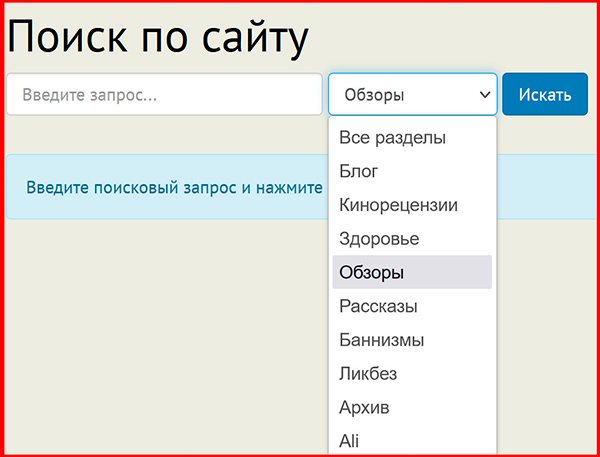 Обратите внимание, что по умолчанию поиск делается по всему сайту, но вы можете для поиска выбрать конкретный раздел.