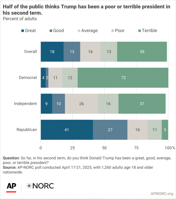 Около половины населения считает, что Трамп пока что плохо или очень плохо справляется с обязанностями президента во втором сроке, около 2 из 10 оценивают его президентство как среднее, а 3 из 10 считают, что он справляется отлично или хорошо.