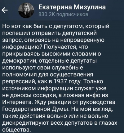 Прошу <...> поручить <...> провести проверку деятельности Екатерины Мизулиной по данному и другим аналогичным случаям на предмет возможного наличия признаков противоправных действий, в том числе вымогательства. (Отсюда.)