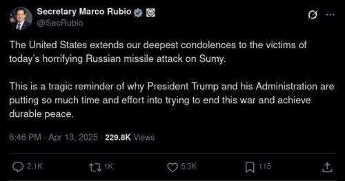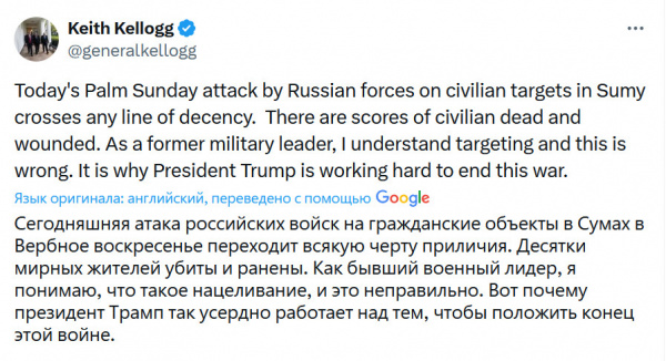 Upd: Старина Рубио высказался более определенно (без дураков). Атаку на Сумы назвал "ужасающей" - все-таки Рубио оказался меньшей кисейной барышней, чем бравый генерал. Впрочем, он, конечно, заметил, что эта трагедия - напоминает о том, почему ПРЕЗИДЕНТ СОЕДИНЕННЫХ ШТАТОВ АМЕРИКИ ДОНАЛЬД ДЖ. ТРАМП так усердно работает над тем, чтобы добиться мира. Вон, уже Уиткоффа в очередной раз заслал, так что мир уже буквально на пороге.