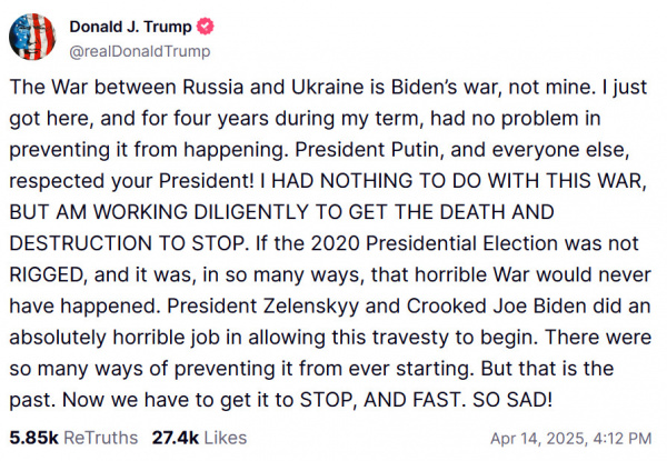 Война между Россией и Украиной - это война Байдена, а не моя. Я только что пришел сюда и в течение четырех лет своего срока без проблем предотвращал ее. Президент Путин, да и все остальные, уважали вашего президента! Я НЕ ИМЕЮ НИКАКОГО ОТНОШЕНИЯ К ЭТОЙ ВОЙНЕ, НО УСЕРДНО РАБОТАЮ НАД ТЕМ, ЧТОБЫ СМЕРТЬ И РАЗРУШЕНИЯ ПРЕКРАТИЛИСЬ. Если бы президентские выборы 2020 года не были сфальсифицированы, а они были сфальсифицированы во многих отношениях, эта ужасная война никогда бы не случилась. Президент Зеленский и продажный Джо Байден проделали совершенно ужасную работу, позволив этому ужасу начаться. Было так много способов предотвратить ее начало. Но это уже в прошлом. Теперь мы должны сделать так, чтобы это прекратилось, причем быстро. ОЧЕНЬ ЖАЛЬ!