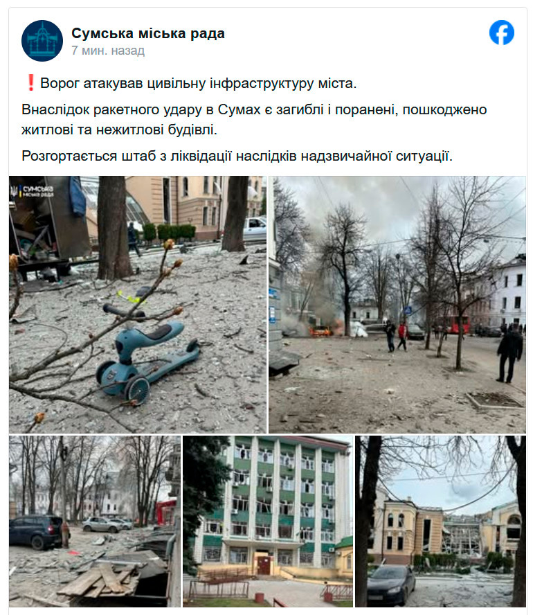 Сегодня российская армия нанесла удары баллистическими ракетами по городу Сумы. По подтвержденной в том числе Владимиром Зеленским информации сообщается о 34 погибших мирных жителей, еще 117 человек были ранены, включая детей и младенца 2025 года рождения.