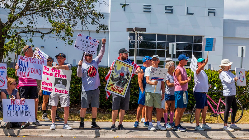 Протестующие стоят у дилер-центра Tesla и размахивают плакатами против Маска
