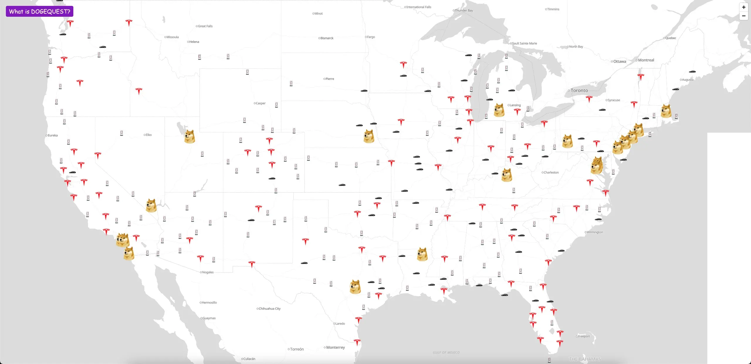 Дальше - больше. Кто-то запустил сайт под названием «DOGEQUEST», который якобы показывает местоположение зарядных станций Tesla, дилерских центров и владельцев Tesla. На сайте изображена карта Соединенных Штатов, а пользователи перемещаются по ней с помощью курсора в форме коктейля Молотова. Нажав на отдельные автомобили, можно получить личную информацию о предполагаемых владельцах Tesla. Среди них - имя, адрес, номер телефона, электронная почта и информация о работе.