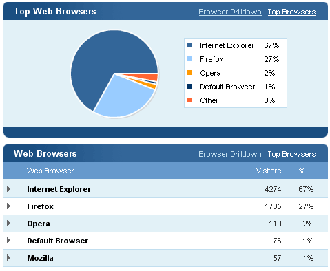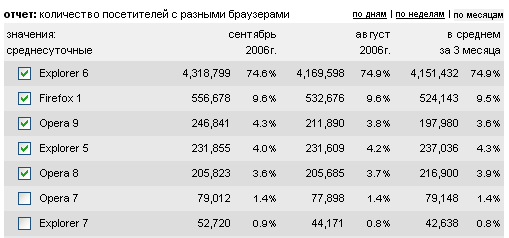 Цифры отличаются очень заметно. Здесь Explorer явно 80%, Firefox под 11%, Opera под 8%. У них цифры разнятся раза в два по всем показателям. Это что - разная статистика по Рунету и Интернету? Или все-таки W3Counter данные берет из опросов (тогда все понятно, лажа), а не из собранной статистики?
