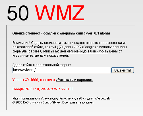 Вероятно, имеется в виду текстовая ссылка где-нибудь снизу морды для повышения все того же индекса цитирования. Ну, в общем, тогда хоть понятен механизм расчета, хотя то что он выдал по поводу exler.ru, с реальной ценой разнится примерно раза в два. Но порядок более или менее показывает - с этим не поспоришь.