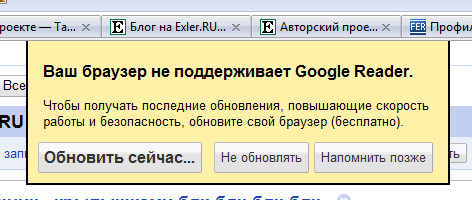 При этом FireFox у меня самый последний - 3.6.9. Нажатие кнопки "Обновить сейчас" приводит к трехстраничной рекламке о том, что при этом добавится в Google Reader, и последняя страница далее никуда не ведет, кроме предыдущих. Кнопка "Не обновлять", равно как и "Напомнить позже", приводят к тому, что окно все время появляется опять.