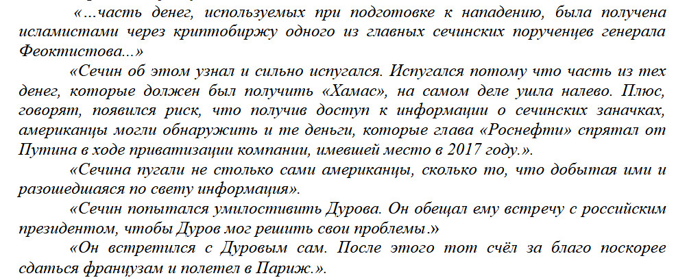 В чем там суть? Политолог Аббас Галлямов в своем ТГ после ареста Дурова во Франции сделал один пост, в котором пересказал гуляющую в определенных кругах историю, связывающую Сечина с Дуровым и его последующим прилетом во Францию. История была типа такой байки, Галлямов сам написал, что не ручается за ее достоверность.