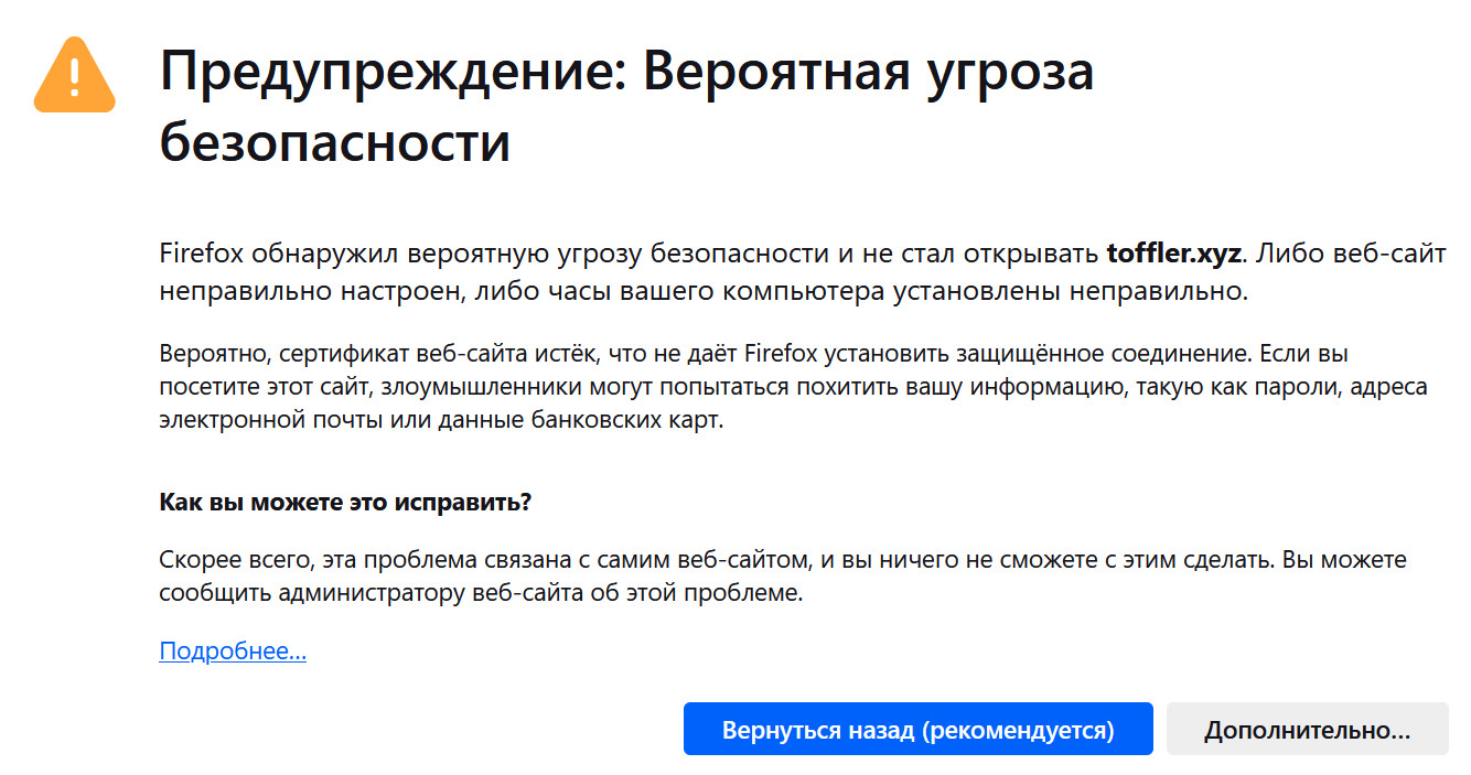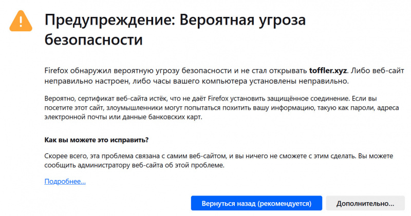 У моих сайтов сегодня должны были обновиться сертификаты безопасности. У основных трех доменов сертификаты нормально обновились, а у специального домена для РФ toffler.xyz - почему-то не обновился, теперь браузер ругается. Угрозы безопасности нет, просто сертификат надо обновить: админ как появится - сразу поправит. Как говорится, приносим свои неудобства за причиненные извинения!