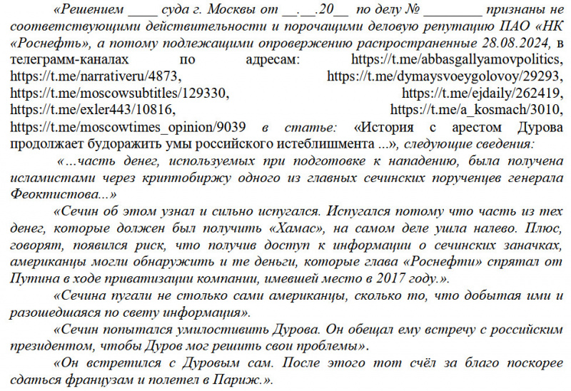 Сечин в лице Роснефти подал в суд, суд постановил удалить этот пост (у Галлямова он уже удален) и его перепечатки.