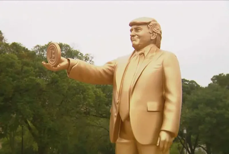 В США в полутора километрах от Белого дома установили золотую статую президента США Дональда Трампа с биткоином в руке.