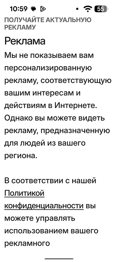 Но с одним приложением мы наступили на любопытные грабли. Для прогноза погоды мы используем приложение The Weather Channel - оно нам нравится больше остальных. Запустили на новом смартфоне это приложение, делаем первичную настройку, соглашаемся со всякими пользовательскими соглашениями, и в самый последний момент, когда нужно было подтвердить настройку рекламы, после чего программа должна была запуститься, мы получили вот это, где не было никаких кнопок, и дальше пройти было нельзя. По ссылке с "Политики конфиденциальности" в браузере просто открывался документ. И все, клинч!