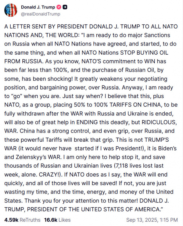 ПИСЬМО, НАПРАВЛЕННОЕ ПРЕЗИДЕНТОМ ДОНАЛДОМ ТРАМПОМ ВСЕМ СТРАНАМ НАТО И ВСЕМУ МИРУ: «Я готов ввести серьезные санкции против России, когда все страны НАТО согласятся и начнут делать то же самое, и когда все страны НАТО ПЕРЕСТАНУТ ПОКУПАТЬ НЕФТЬ У РОССИИ. Как вы знаете, приверженность НАТО к ПОБЕДЕ была далеко не стопроцентной, а покупка российской нефти некоторыми из вас была шокирующей! Это значительно ослабляет вашу переговорную позицию и переговорную силу по отношению к России. В любом случае, я готов «начать», когда вы будете готовы. Просто скажите, когда? Я считаю, что это, а также введение НАТО как группой 50-100-процентных пошлин на Китай, которые будут полностью отменены после окончания войны с Россией и Украиной, также будут очень полезны для прекращения этой смертельной, но нелепой войны. Китай имеет сильный контроль и даже влияние на Россию, и эти мощные тарифы сломают это влияние. Это не война Трампа (она бы никогда не началась, если бы я был президентом!), это война Байдена и Зеленского. Я здесь только для того, чтобы помочь остановить ее и спасти тысячи жизней россиян и украинцев (только за прошедшую неделю погибло 7118 человек. БЕЗУМИЕ!). Если НАТО поступит так, как я говорю, ВОЙНА быстро закончится, и все эти жизни будут спасены! Если нет, вы просто тратите мое время, а также время, энергию и деньги Соединенных Штатов. Спасибо за внимание к этому вопросу! ДОНАЛЬД Дж. ТРАМП, ПРЕЗИДЕНТ СОЕДИНЕННЫХ ШТАТОВ АМЕРИКИ».