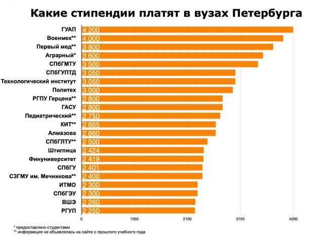 Прислали интересную статистику - стипендии в различных вузах Питера для обычных студентов и для отличников.
