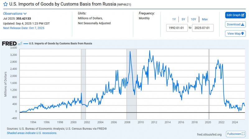 За первое полугодие 2025 года, при Трампе, США из РФ импортировали товаров на 2,5 млрд долларов. Нарастили почти в полтора раза.