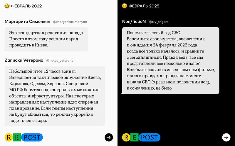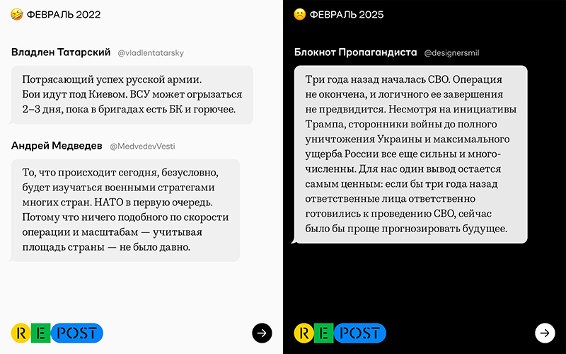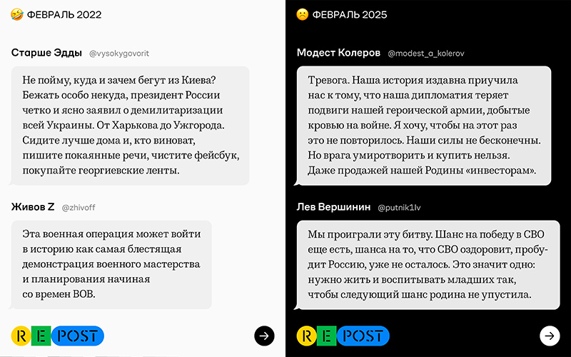 В издании Repost сделали хорошую подборку высказываний z-патриотов в начале войны и через три года войны. Очень, знаете ли, наглядно получилось.