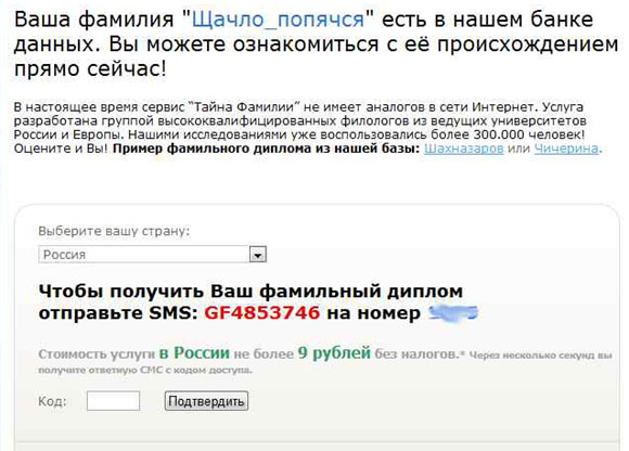 С тайной фамилии еще веселее. На сайте просят ввести фамилию и сообщают, что она, дескать, есть в базе. Заплати SMS, которое реально будет стоить намного дороже, чем они обещают, после чего, дескать, что-нибудь получить. А точнее, ни черта не получишь. (Так же, как и в случае определения местоположения мобильника и обещаний дать прочитать чужие SMS.)