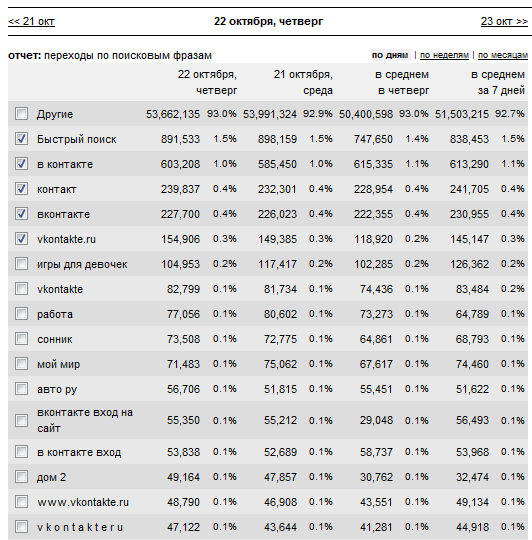 Любопытная статистика. Это TOP переходов по поисковым запросам примерно 20% сайтов зоны RU. Запрос "одноклассники" - на 23 месте. Они доигрались. Туда им и дорога.