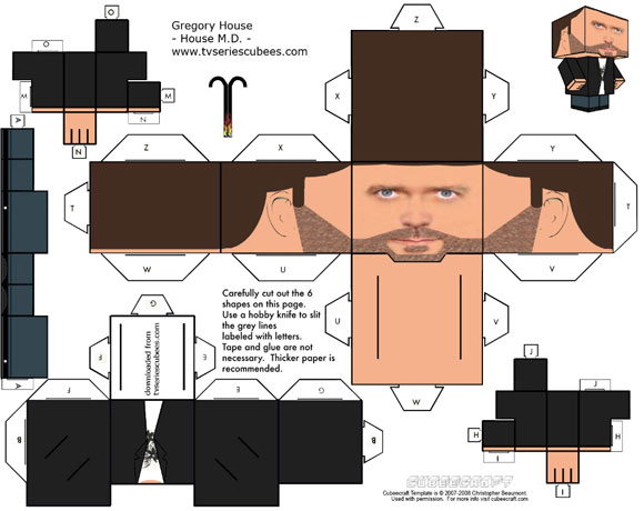Для фанатов сериалов или наоборот - для тех, кого друзья и знакомые с этими сериалами достали до невозможности - сайт TVSeriesCubees. Там предлагаются бумажные раскладки различных персонажей из сериалов. Вот, например, такой доктор Хаус.