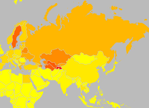 Так как слово написано по-русски, понятно, что плотность интереса из других стран формируют наши бывшие соотечественники. Но почему тут на первом месте Швеция (213), Туркмения (228) и Узбекистан (227) - непонятно!