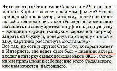 В "Собеседнике" - интервью с Садальским. Интервью никакое (собственно, я бы удивился обратному), но мне понравилась фраза в подводке к интервью.
