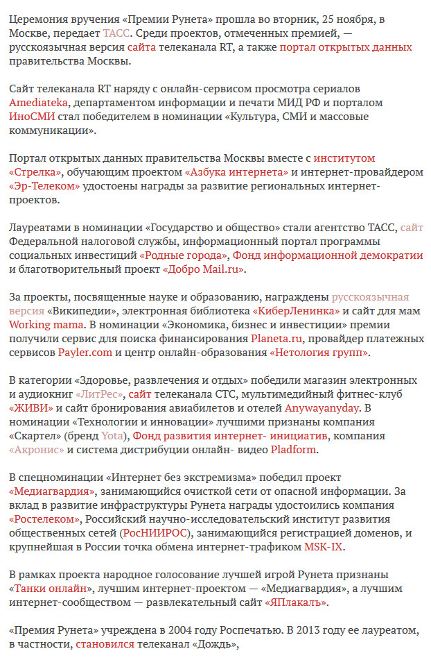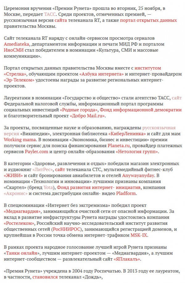 Сегодня посмотрел на заметку на "Ленте" об очередной "Премии". Вот мой результат (посещенные ссылки бледнее). При этом на "ТАСС" я заходил один раз (проверял, правда ли они опубликовали ту хрень, на которую кто-то ссылался), на сайт ФНС захожу постоянно (как законопослушный плательщик налогов), на "Википедию" - постоянно, на сайт "Литрес" изредка, на сайт Yota изредка (жил бы в Москве, заходил бы чаще), на сайт "Акронис" тоже изредка захожу (пользуюсь их продуктами). У меня получилось: на 2 сайта - постоянно, на 3 - изредка, на 1 - один раз. А у вас? Какие у вас получились результаты очередной интернет-премии?
