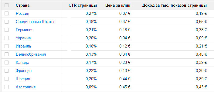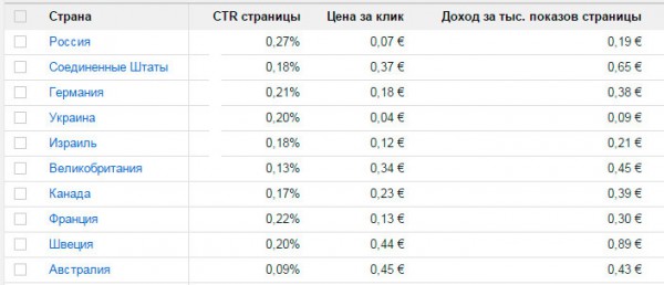 Итак. Статистика по странам за последние 15 дней. Обратите внимание на уровень дохода за тысячу показов по разным странам. И на цену за клик.