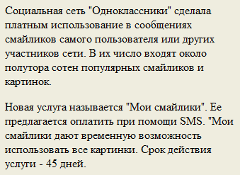 P.S. Причем заметьте, они сделали платными использование смайликов, которые разрабатывали совершенно другие люди, и на использование которых у "Одноклассников" никаких прав нет. Чудесные ребята, просто чудесные! Сперли смайлики, а теперь их продают. Бижнесмены!
