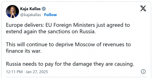 Главы МИД стран Евросоюза единогласно поддержали продление санкций против России. Об этом на своей странице в Twitter (Х) написала верховный представитель Евросоюза по иностранным делам и политике безопасности Кая Каллас.