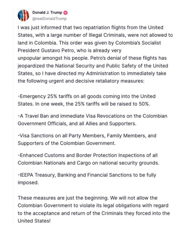 Немедленный ввод 25% пошлины на весь колумбийский экспорт в США, объявил о дополнительном повышении до 50% через неделю. Аннулировал американские визы для всех членов колумбийского парламента, их семей и соратников. Ввел санкции против финансового сектора Колумбии.