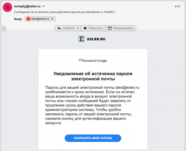 Приходит вот такое письмецо. Ну, очевидно, что жулье, но это мне очевидно, как владельцу почты exler.ru (ну и если заглянуть в служебные строки, то видно, конечно, что отправлено от какого-то mail.tiss.edu).