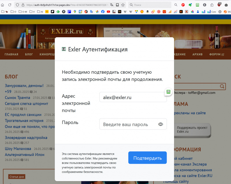 Остальные постоянные домены - exler.me и exler.es открываются нормально, так что если у вас exler.ru заглючил - поменяйте закладку на exler.me пока.