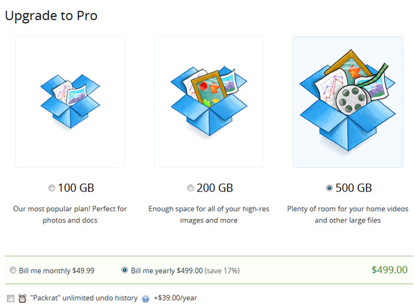 Dropbox, конечно, штука хорошая и я им пользуюсь (подробная статья) для хранения оперативных архивов. Но есть вещи, которые меня в нем конкретно не устраивают. Прежде всего, по умолчанию Dropbox дает всего 2 Гб (ну или 4 Гб, если вы пришли по приглашению). Пространства, конечно, можно докупить, причем стоит это более или менее разумно - по доллару за гигабайт хранилища в год, то есть 200 Гб в год обойдутся в $200, а 500 Гб - в $500. Но тут сразу заметный минус - всего три тарифных плана. Если мне нужно, например, 250 Гб, то придется покупать уже 500, то есть я в два раза переплачиваю.